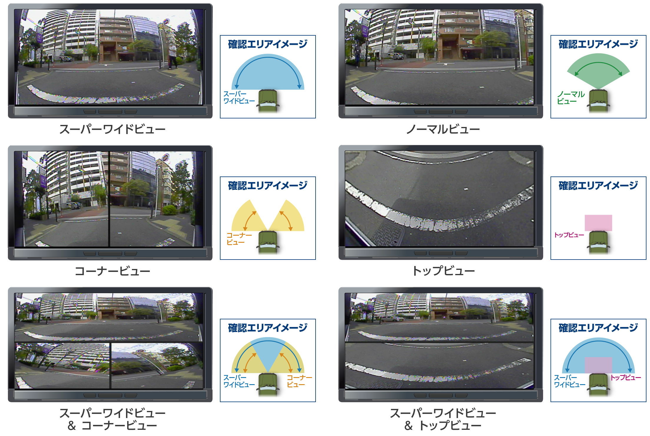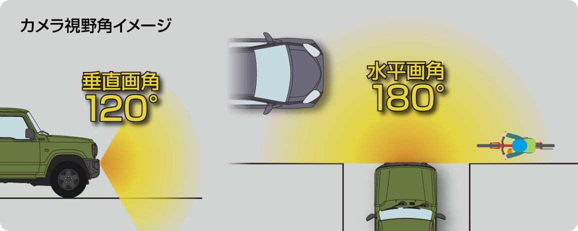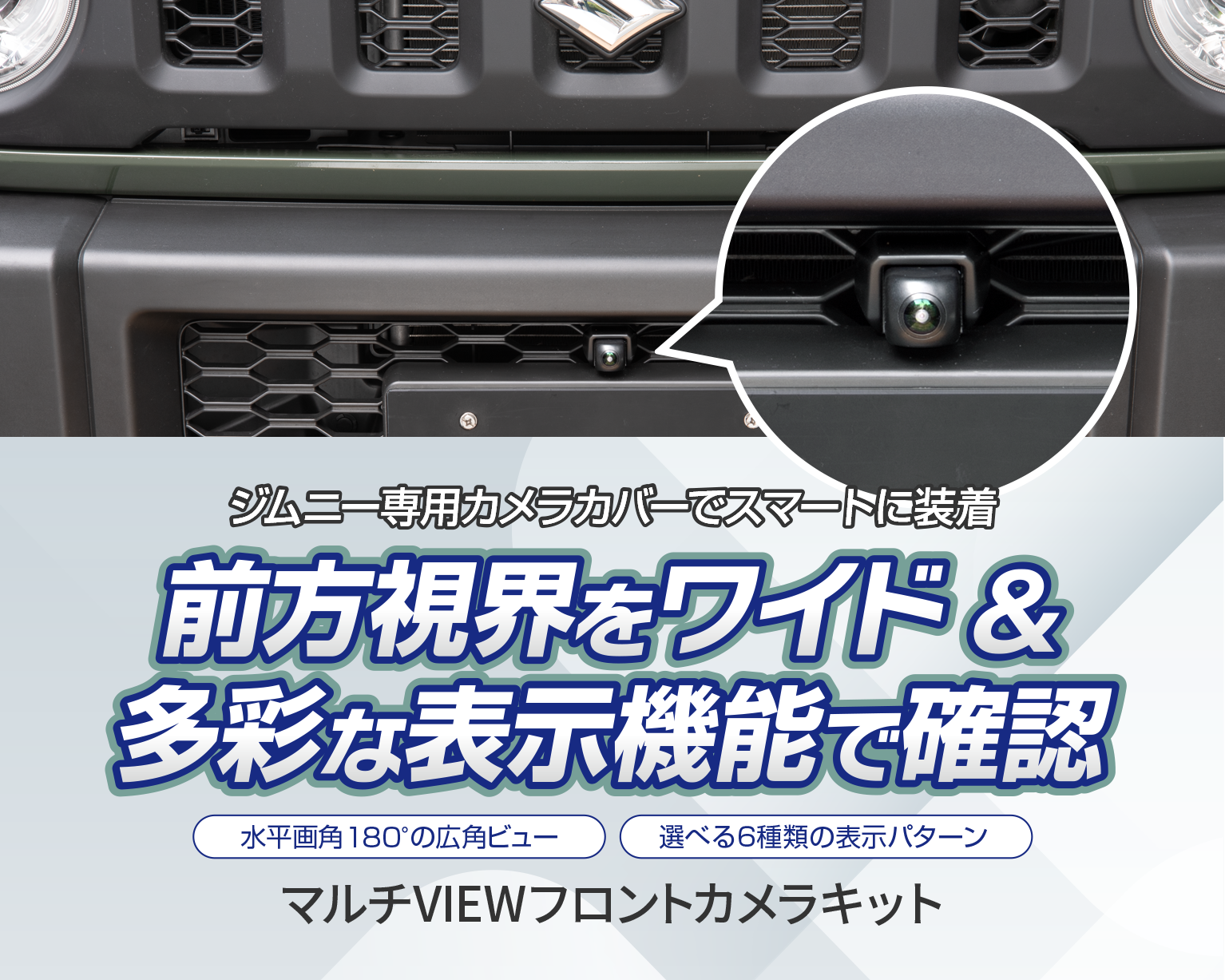 ジムニー用マルチVIEWフロントカメラキットは、水平画角180°の広角カメラを採用したマルチVIEWカメラと、車種専用デザインのカメラカバーを組み合わせた画期的なカメラキットです。フロントバンパーのロアグリル部分にスマートに装着でき、6パターンの多彩な表示機能により状況に応じて広範囲の前方視界を確認可能。ジムニー(JB64W)用と、シエラ(JB74W)・ノマド(JC74W)用の2種類をラインアップしています。