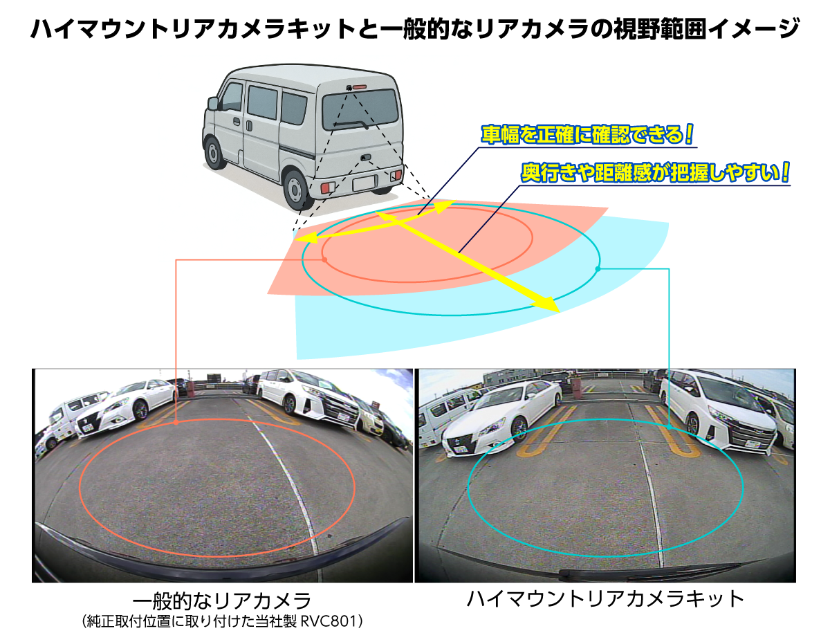 後方の視界を、高い視点からハイマウントリアカメラキットをご紹介! ハイマウントリアカメラキットは、ウォッシャーノズルの取り付け穴を活用して、高い位置にリアカメラを設置できます。