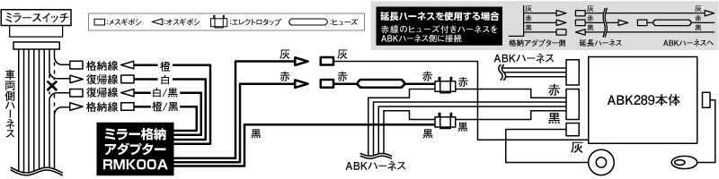 RMK00Aを接続する場合、車両側配線を切断加工しての直接結線となります。