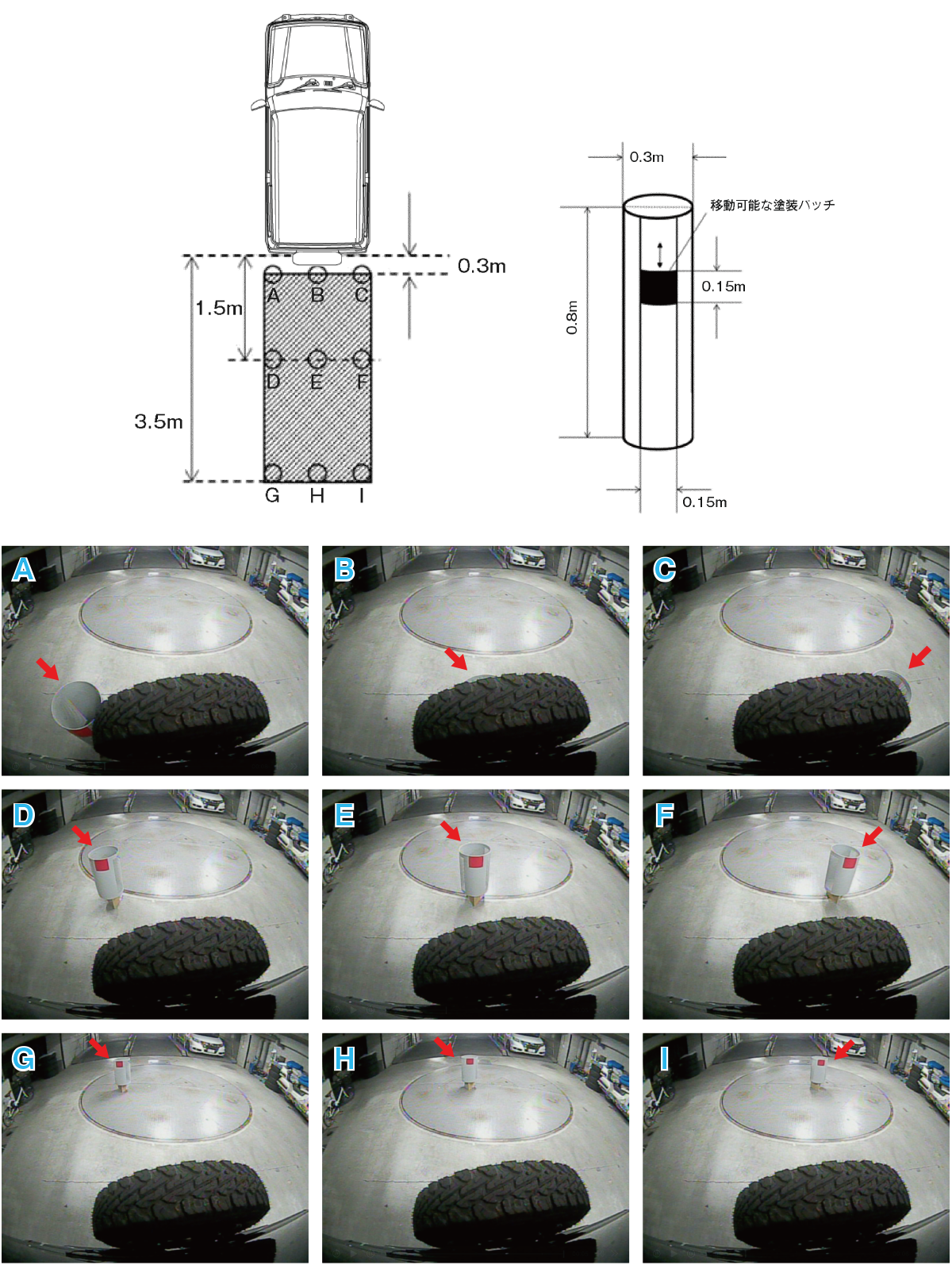 技術基準では、図で示す範囲に試験対象物を設置して下記のように視認できることを要件としています。