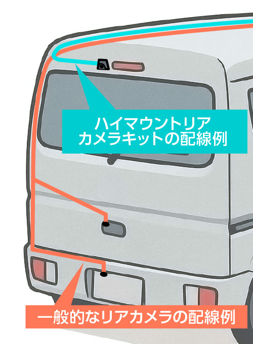 ![]() ハイマウントリアカメラキットは高い位置から後方を映せるため、車両の左右端が見えやすく、車幅を正確に確認できます。 さらに、奥行きや距離感が把握しやすく、安全な後退操作をサポートします。 配線の引き回しがシンプルで、取り付けがラク! ハイマウントリアカメラはバックドア上部に近い位置へ取り付けるため、ナンバーガーニッシュやバックドアハンドル付近に設置される一般的なリアカメラより配線の引き回しがシンプルで、装着作業の効率が向上します。