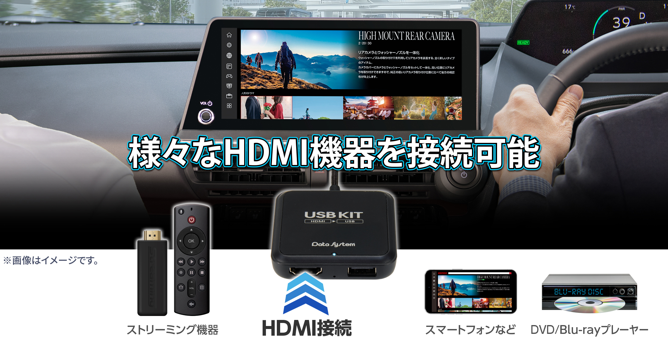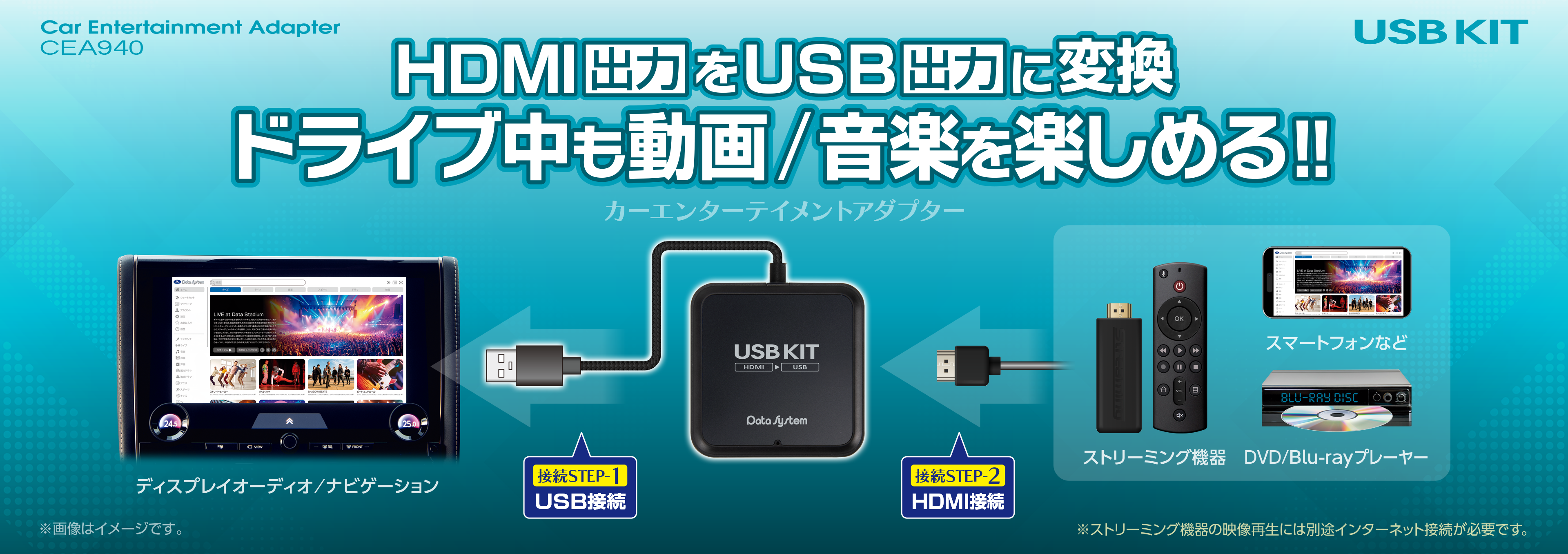 カーエンターテイメントアダプターUSBKIT CEA940は、有線接続のApple CarPlayに対応したディスプレイオーディオやナビゲーションにHDMI機器を接続できるUSB-HDMI変換アダプターです。本製品を使用することより、ドライブ中でもHDMI入力による多彩な映像コンテンツをお楽しみいただけます。また、Apple CarPlay・Android Auto™をワイヤレスで接続することもできます。